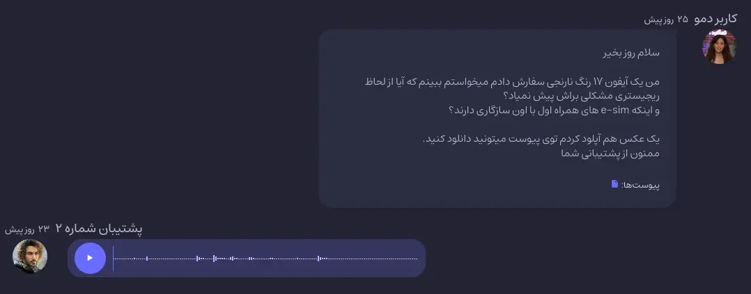 ارسال فایل، ویس صوتی و پاسخ آماده. اتصال به هوش مصنوعی. دنیایی از امکانات را تجربه کنید.